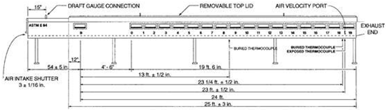 ASTM E84的測試設(shè)備是一個隧道爐,長約7.6m,詳見下圖。