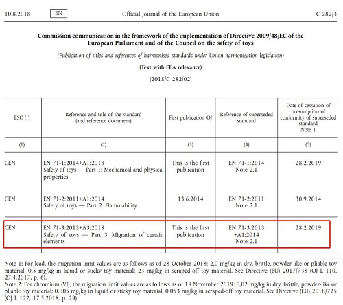 目前玩具指令特定元素遷移的協(xié)調(diào)標準為EN 71-3:2013+A3:2018。