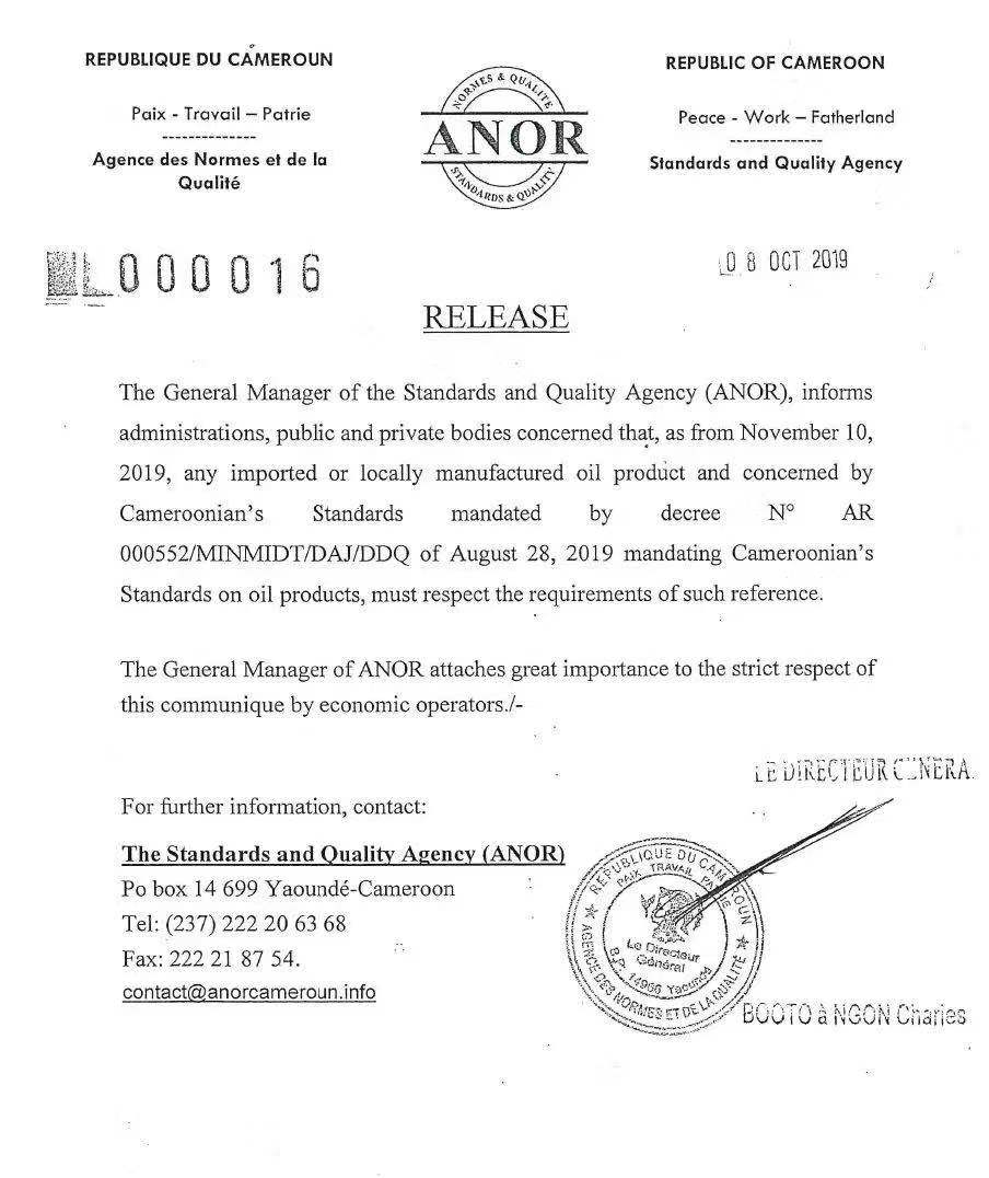 近日,喀麥隆標(biāo)準(zhǔn)與質(zhì)量局ANOR通知喀麥隆裝船前符合性評(píng)估方案 PECAE (Cameroun Pre-shipment Evaluation of Conformity) 更新要求。自2019年11月10日起(合同日期或發(fā)票日期),所有進(jìn)口至喀麥隆或當(dāng)?shù)厣a(chǎn)的且在法令A(yù)R000552/MINMIDT/DAJ/DDQ要求下的喀麥隆標(biāo)準(zhǔn)相關(guān)的石油產(chǎn)品,被列入PECAE的管控范圍內(nèi), 并開(kāi)始強(qiáng)制執(zhí)行其規(guī)定的產(chǎn)品符合性評(píng)定程序。