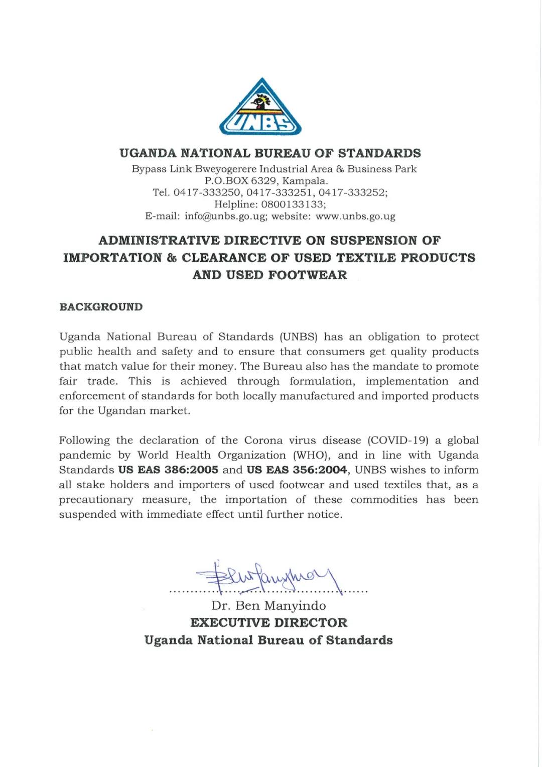受新冠病毒COVID-19疫情原因,烏干達國家標準局 UNBS(Uganda National Bureau of Standards)發(fā)布通知,即日起暫停二手服裝,二手鞋類的進口。該要求即時生效。