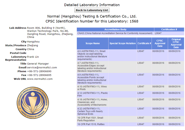2016年6月9日,NormalTCI諾莫檢測實驗室獲得美國消費品安全委員會(CPSC)的授權(quán)認(rèn)可(ID:1568)。
