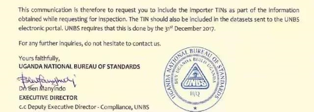 烏干達(dá)UNBS要求增加TIN號(hào)碼和啟用CoC電子證書(shū)