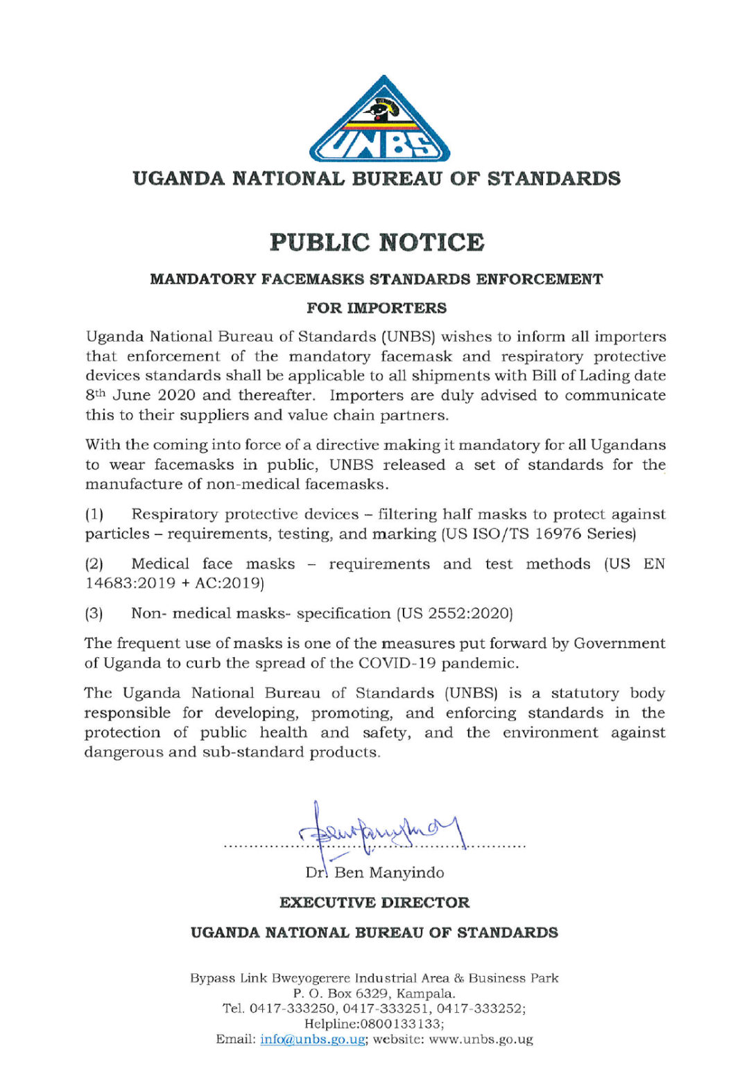 烏干達(dá)國家標(biāo)準(zhǔn)局 UNBS(Uganda National Bureau of Standards)最新公告, 為了保護(hù)公眾健康和安全,從2020年6月8日(提單日期)起,口罩和呼吸防護(hù)設(shè)備出口至烏干達(dá)需要強(qiáng)制執(zhí)行如下標(biāo)準(zhǔn):