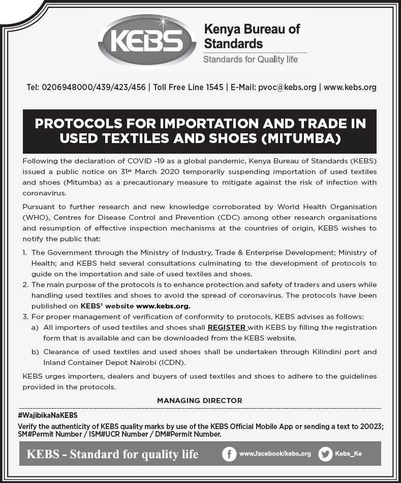 近日,肯尼亞標(biāo)準(zhǔn)局Kenya Bureau Of Standards (KEBS) 頒布,肯尼亞將恢復(fù)二手服裝與二手鞋類產(chǎn)品的進(jìn)口與銷售,同時(shí)KEBS已制定新協(xié)議進(jìn)行規(guī)范與指導(dǎo)。該協(xié)議的主要目的為加強(qiáng)對貿(mào)易商與消費(fèi)者/ 使用者的保護(hù)與安全,避免疫情的傳播。該協(xié)議已發(fā)布在KEBS官方網(wǎng)站。