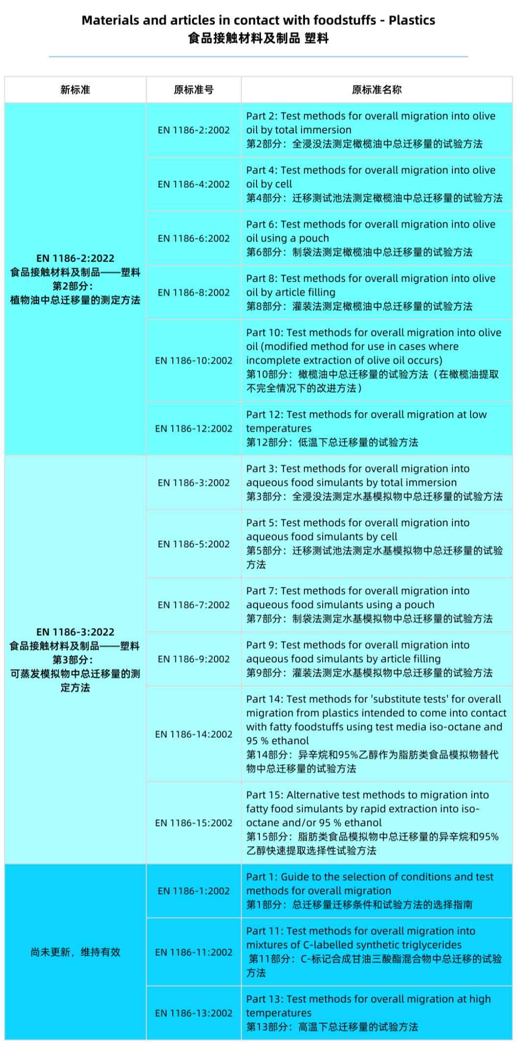 新版EN 1186-2:2022:將測試“橄欖油中總遷移量”的原六項2002版標準EN 1186-2、1186-4、1186-6、1186-8、1186-10和1186-12整合為一個標準。