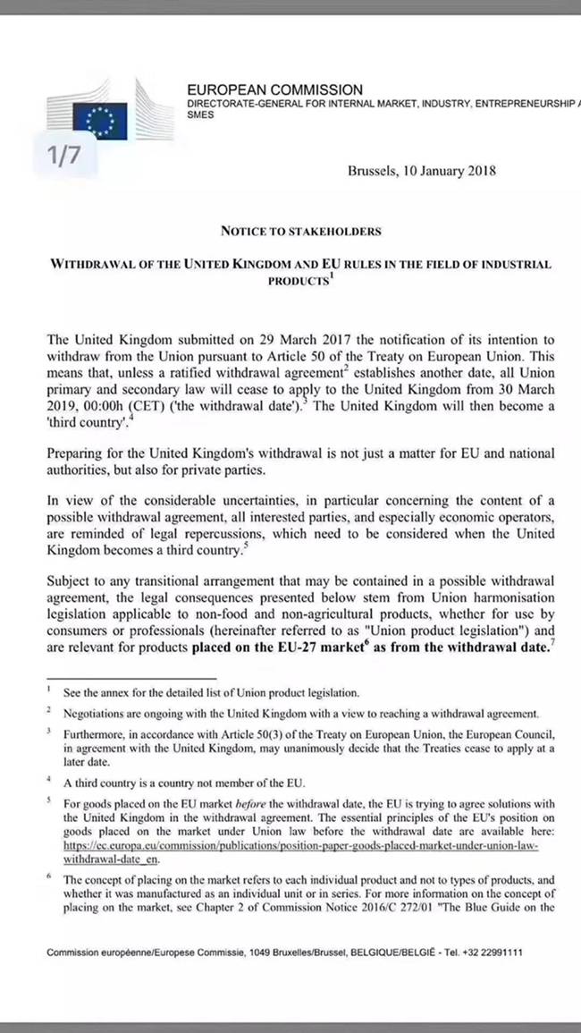 2018年1月10日,歐盟委員會發(fā)布一份給利益相關方的通告,《Notice to Stakeholders: Withdraw of theUnited Kingdom and EU Rules in the Field of Industrial Products》 說明了一些英國退歐對于工業(yè)產品相關方面歐盟規(guī)則的事宜。