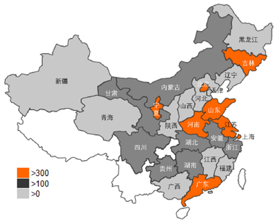 按照省市地劃分.廣東省.江蘇省.河南省.山東省.寧夏回族自治區(qū).吉林省.上海市.北京市等地發(fā)現(xiàn)的不合格項目數(shù)比較多。
