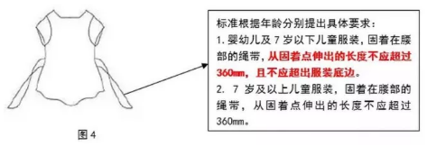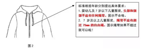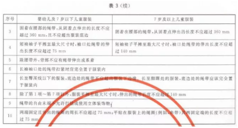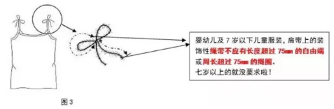 標(biāo)準(zhǔn)對兒童服裝頭頸、肩部、腰部等不同部位繩帶作出詳細(xì)規(guī)定,要求嬰幼兒及7 歲以下兒童服裝頭頸部不允許存在任何繩帶;